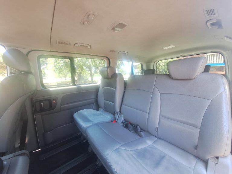 Key Features and Specifications: -Engine: 2.5-liter CRDi turbodiesel engine. -Transmission: 5-speed automatic. -Seating Capacity: Available in 9-seater or 12-seater configurations. -Comfort & Convenience: Leather seats, touchscreen infotainment, Bluetooth, USB/AUX inputs, multifunctional steering wheel, and cruise control. -Safety & Utility: Rear park distance control, reverse camera, fog lights, and ABS with EBD. -Design: Alloy wheels and sliding doors.